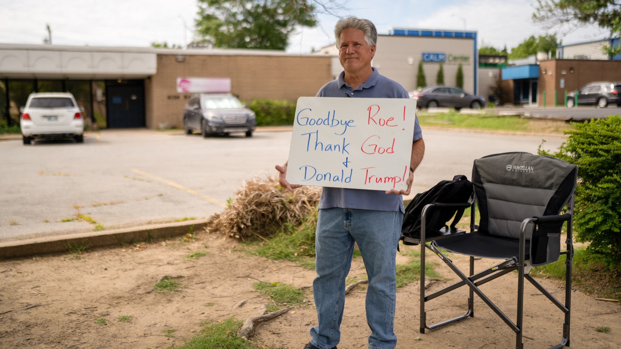 "I'm praising God and Donald Trump," said Tim Beach, a former school teacher who protests on the curb with a whiteboard bearing hand-written anti-abortion slogans.