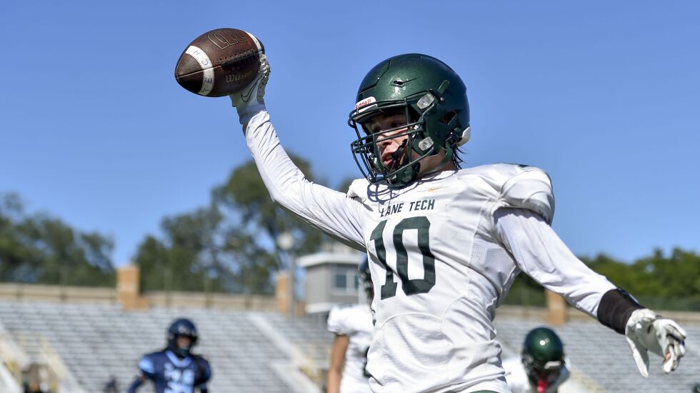 The senior receiver caught three touchdown passes from Noah Mayra as Lane beat Hyde Park 32-14 in a Public League Red game Saturday at Eckersall Stadium.