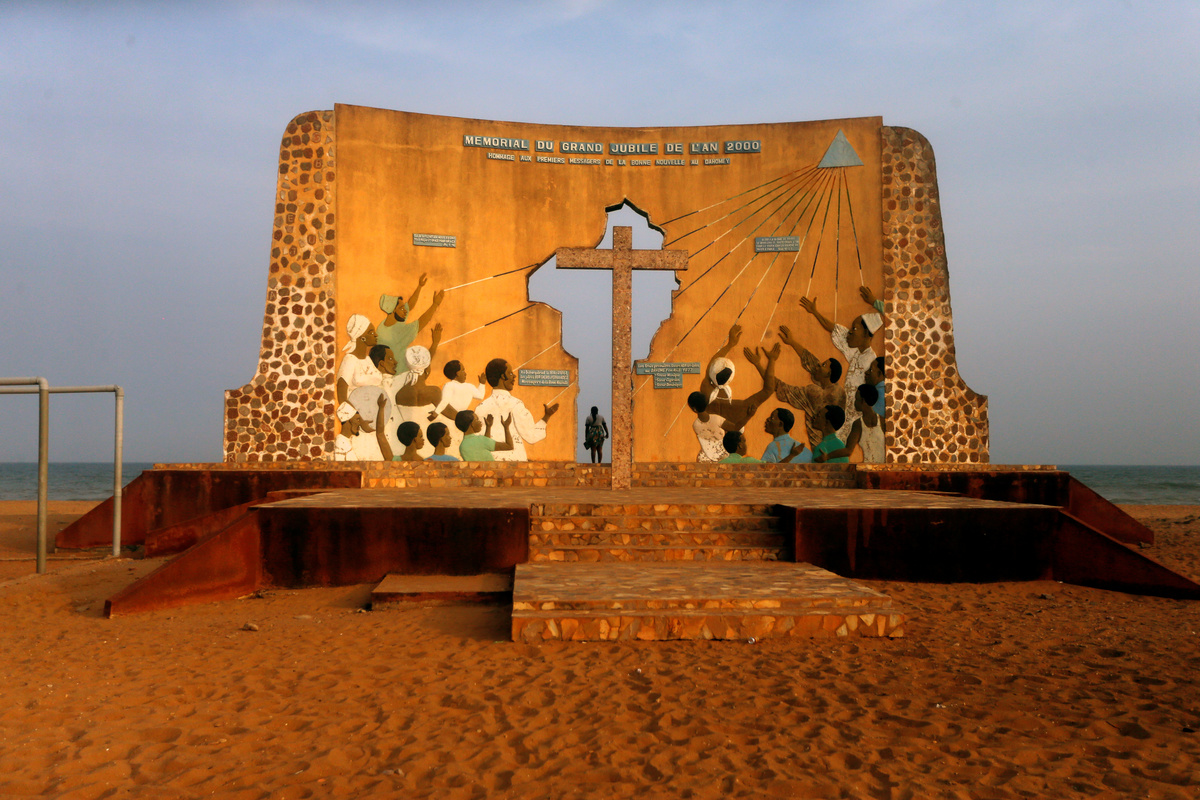 A woman stands beneath a monument commemorating the "Door of No Return" where slaves were loaded onto ships in the historic slave port town Ouidah, Benin, July 18, 2019. . REUTERS/Afolabi Sotunde