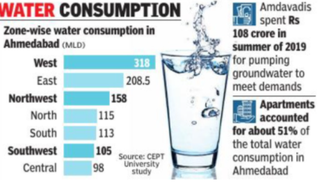 The study, which was part of the CEPT University’s City Studio initiative, indicated that the West zone accounted for 318 MLD, Northwest 158 MLD and Southwest 105 MLD daily water consumption.