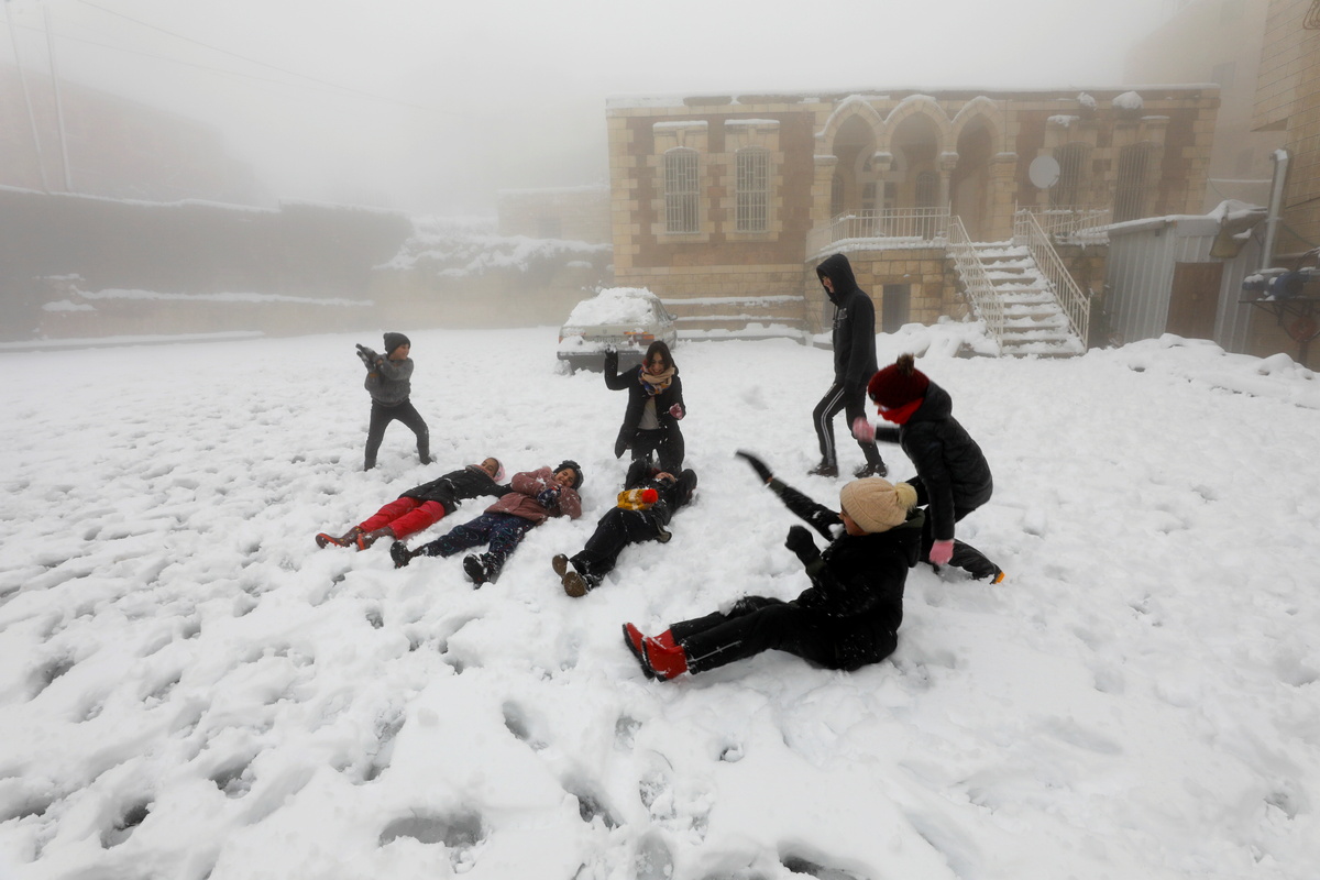 Families built snowmen on the almost empty streets in the Israeli-occupied West Bank, in what was the first snowfall many children had seen in their lives.