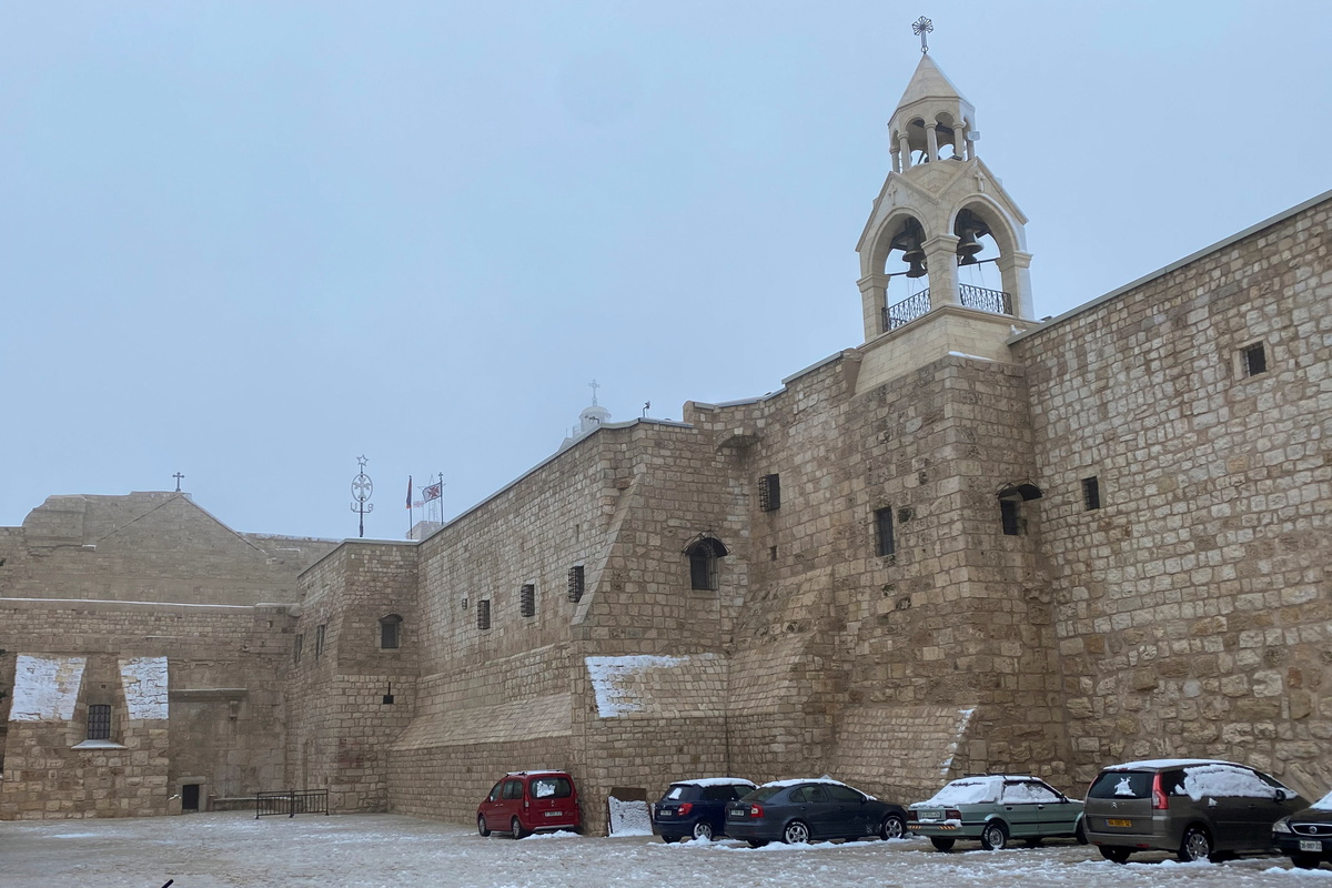 On the usually busy streets of Bethlehem, overlooked by the snow-adorned bell tower of the Church of the Nativity, few cars tried to navigate the fog and icy roads.