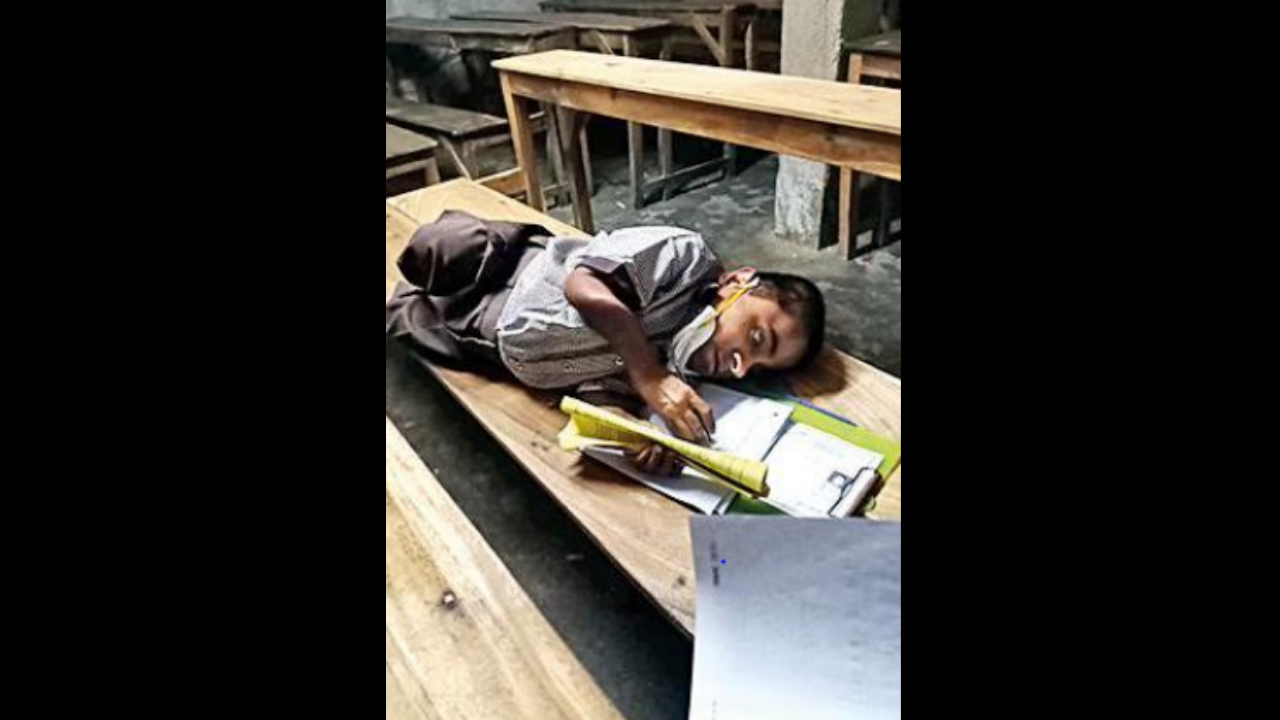 Bapi was born with disabilities that forced him to stay indoors when his friends played in the field or attended classes. But the adversity brought out the best in him. Son of poor garment seller Shahjahan Fakir, Bapi had a knack for knowledge and his parents managed to get him admitted to the Magrahat Kalas High School, where he studied with other kids. In the class, a mat is kept at a corner for him to lie down as he is unable to sit for longer hours.