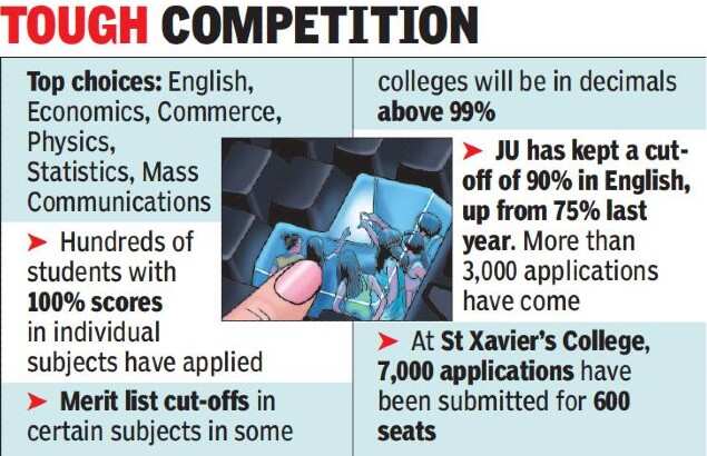 At some colleges, merit list cut-offs for certain subjects have already gone up to 98%-99%. These institutes said they were flooded with applications with 100% marks in the subjects and beyond 99% in the aggregate. So, principals said, students might have to face rejection by a whisker despite high scores.