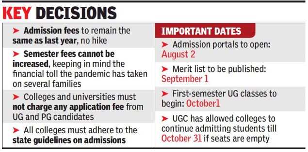 KOLKATA: None of the colleges can increase admission or semester fees this year or charge any application fee from students applying for undergraduate and postgraduate courses. These were some of the decisions taken in an online meeting of college principals across the state on Sunday.