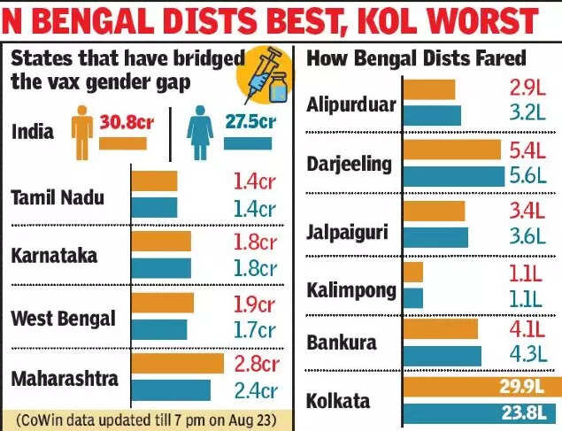 KOLKATA: Bengal has reduced the male-female gender gap in Covid vaccination to less than 20 lakh doses largely aided by the four north Bengal districts of Darjeeling, Alipurduar, Jalpaiguri and Kalimpong, along with Bankura, which have inoculated more women than men.