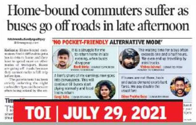 KOLKATA: The two-hour breather in the night curbs from Monday — the night restrictions will kick in at 11pm instead of 9pm — is set to bring relief to thousands of office-goers who use buses to return home. Till Friday, the last bus left its terminus at 5.30pm or 6pm as bus workers had to complete their round trip and get back to garages well before 9pm. Anyone failing to reach their garage was asked by police to pay a hefty fine. However, with the extra two hours, bus owners said they are confident of providing services till 10pm-10.30pm.