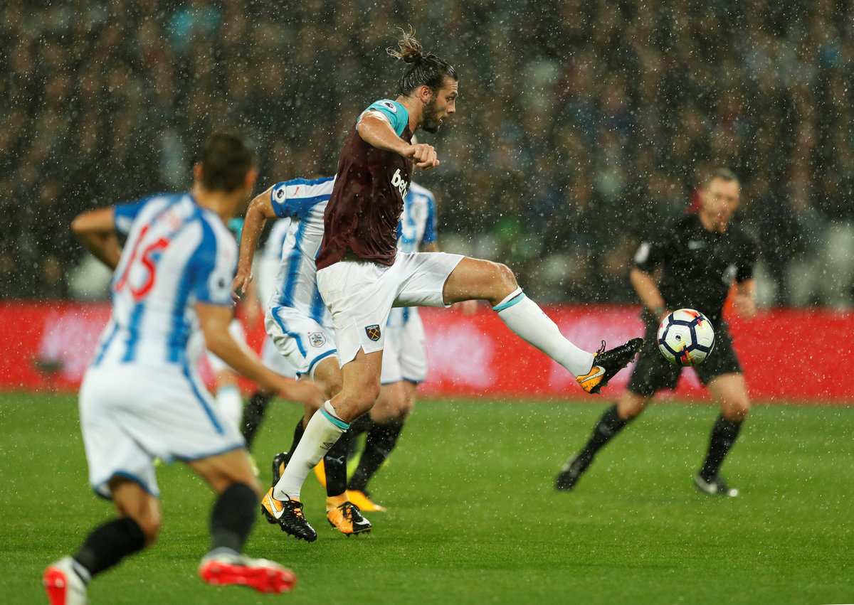 Soccer Football - Premier League - West Ham United vs Huddersfield Town - London, Britain - September 11, 2017 West Ham United's Andy Carroll in action with Huddersfield Town’s Mathias Jorgensen Action Images via Reuters/John Sibley