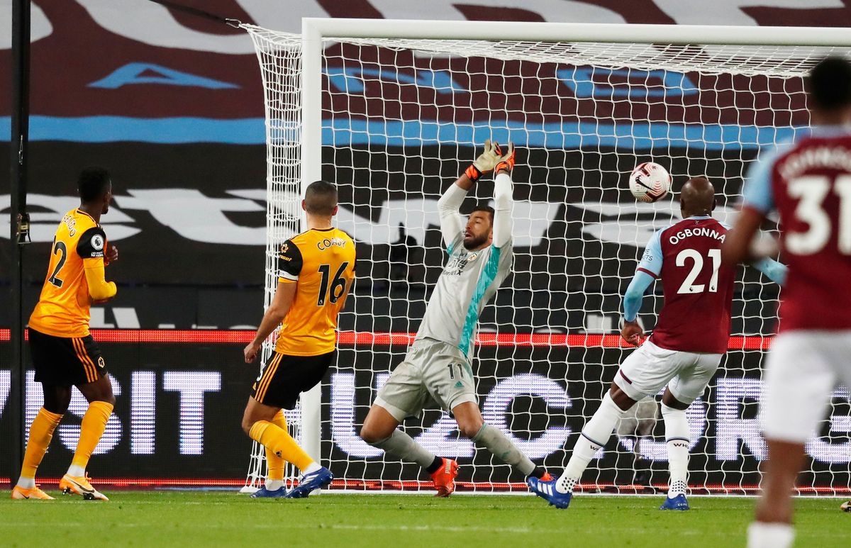Wolves dominated the opening exchanges but fell behind in the 17th minute when the visitors' defender Willy Boly felled Michail Antonio in the centre of the pitch and referee Martin Atkinson allowed Pablo Fornals to take the free kick quickly.