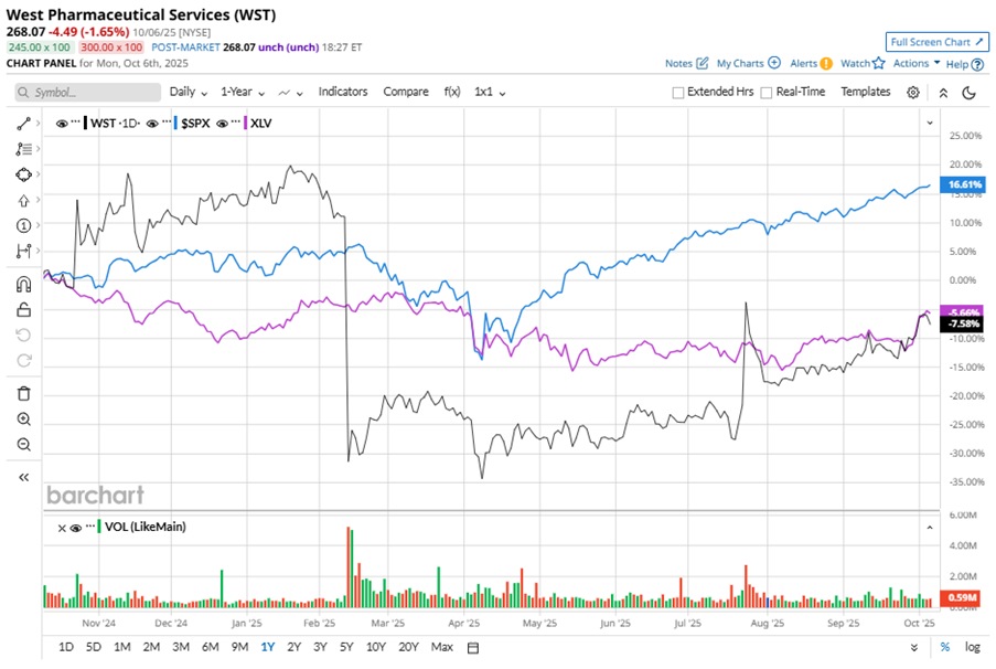 WST stock has underperformed the S&P 500 Index’s ($SPX) 17.2% gains over the past 52 weeks, with shares down 9.6% during this period. Similarly, it underperformed the Health Care Select Sector SPDR Fund’s (XLV) 5% dip over the same time frame.