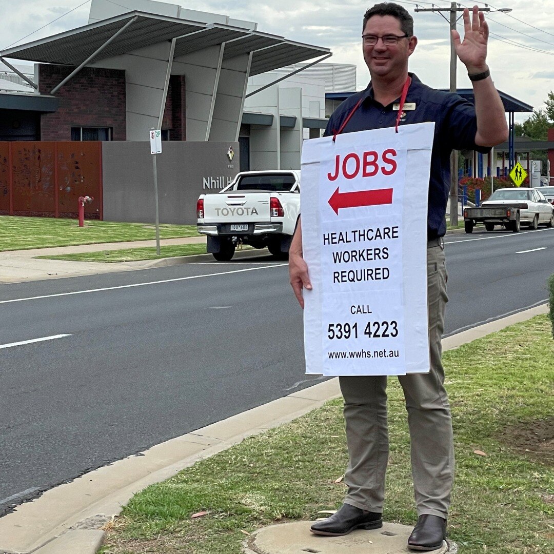 The head of a regional Victorian health service has resorted to standing on the side of a busy highway draped in a sandwich board in a bid to draw attention to the desperate need for healthcare workers.