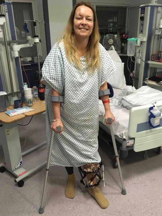 One with the caption “getting stronger every day!” showed Mrs Cochran wearing a hospital gown, standing with the aid of crutches and her leg in a protective frame.