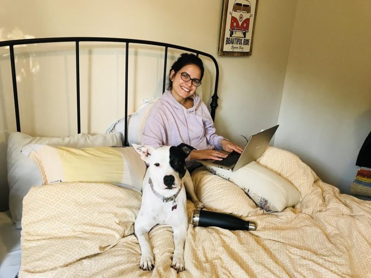 In lockdown on Sydney's northern beaches, the 29-year-old has taken to setting schedules for the company's production room and packing teams, while propped up on a pile of pillows.