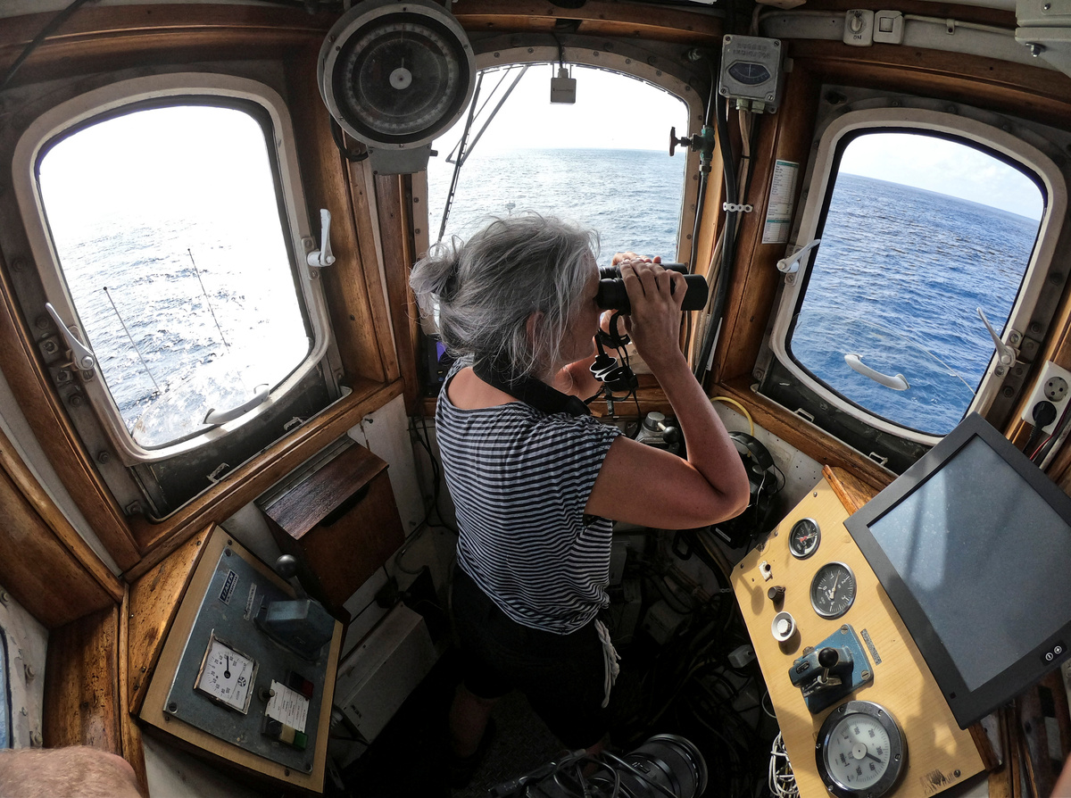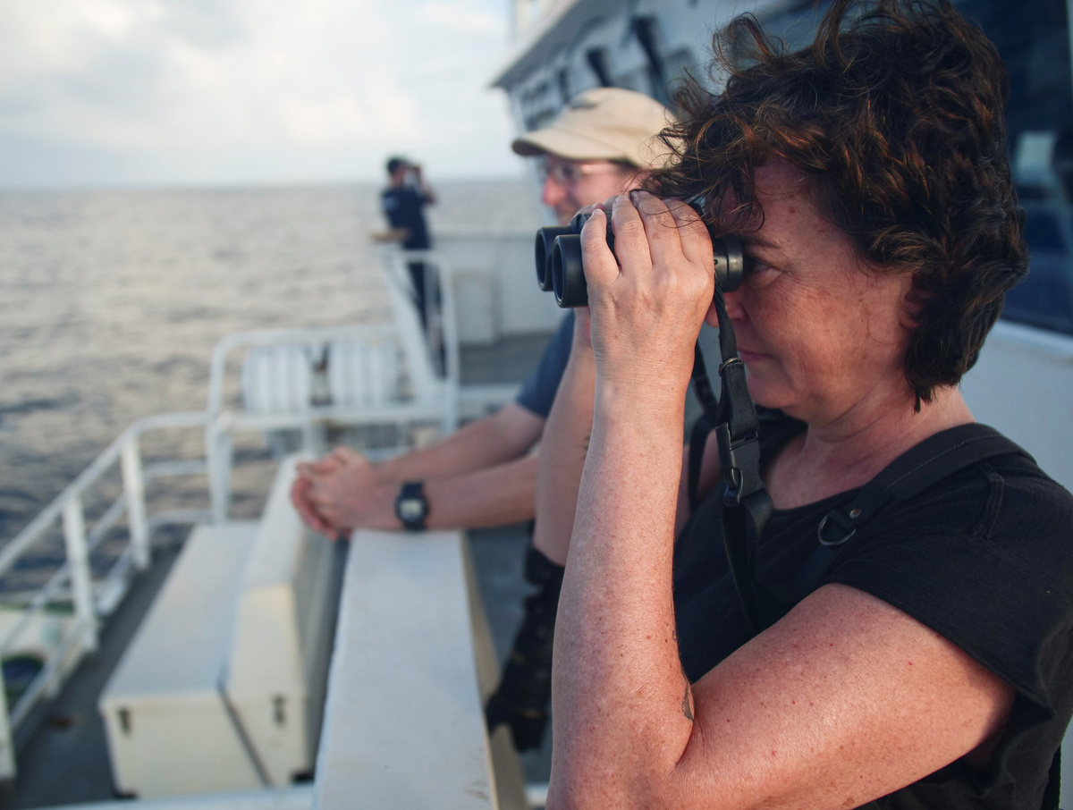 Back on the Greenpeace ship Arctic Sunrise, the crew is still scanning the vast ocean horizon through binoculars for evidence of life, while also sampling water for future DNA testing to determine which species frequent the plateau.