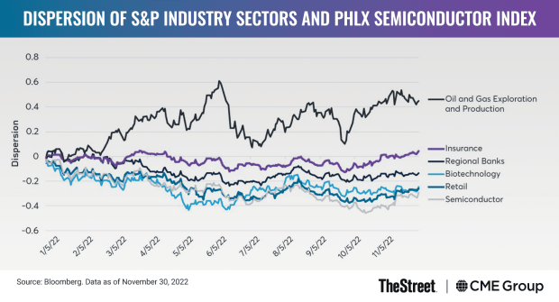 One way to observe trends in differing sectors is to look at each index’s dispersion. The dispersions charted below illustrate the significant opportunities available to traders who want to tailor their risk and exposure by sector, rather than simply trade the parent S&P 500 index. In this case, dispersion is a measure of how volatile the price of each sector index has been since the start of the year. Dispersion, therefore, provides a benchmark of how each sector has fared during 2022, and it is important to consider how this may develop in 2023.