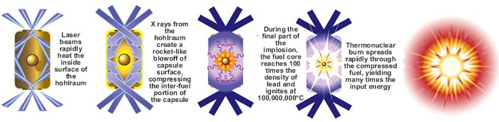 However, the NIF experiment uses inertial confinement fusion, which uses lasers to heat up and explode a tightly packed pellet of hydrogen atoms. Here’s how it works: