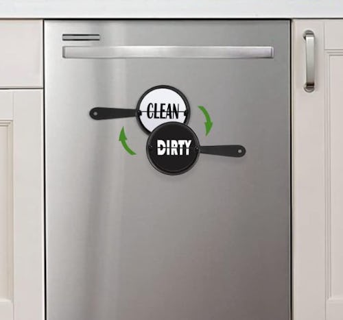 Are the dishes dirty or clean? This is one domestic friction point that can be solved with a simple system. This clean dirty sign tells whoever comes along after you the status of the dishwasher. When you empty it and load dishes into it, flip the sign to dirty. When you run a load, flip it back to clean. The pan is kitchen appropriate, and it mounts with an adhesive or a magnet.