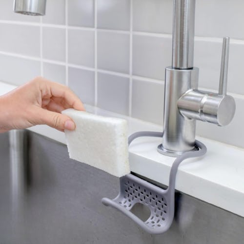 This sponge holder is a clever solution to the eternal problem of where to stash the dishwashing sponge so it drips dry without making a mess on the counters. It loops over the faucet and puts a clever, low-profile, perforated hammock right where you want it. You can also hook it over the divider in a double sink.