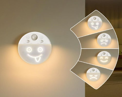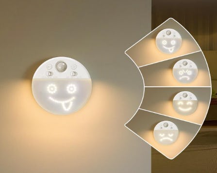 This motion sensor LED night-light is a helpful companion in the dark. It has three modes and many moods. It senses motion and turns on in the dark — or always — when it sees you coming. And it shares an expression, happy, sad, angry, or naughty, to make you feel less alone. You can adjust the brightness to suit your situation, and it's rechargeable, so you can put it anywhere. There are three options.