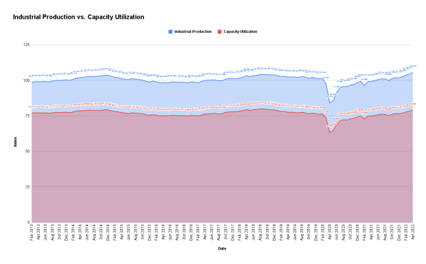 Below are graphs of industrial production and capacity utilization from 2013 to 2022.