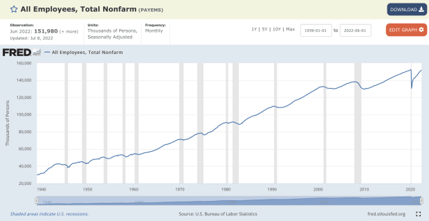 Below is a graph of nonfarm employees, by total per month, from January 1939 to June 2022. The data show a steady increase in nonfarm jobs over that period. During recessions and in some months shortly after, payrolls tended to decline.