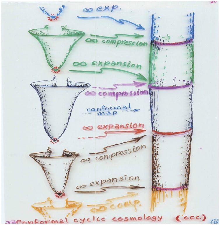 The 2020 Nobel Prize-winning physicist Roger Penrose has proposed one intriguing but controversial model for a cyclical universe dubbed “conformal cyclic cosmology”. Penrose was inspired by an interesting mathematical connection between a very hot, dense, small state of the universe — as it was at the Big Bang — and an extremely cold, empty, expanded state of the universe — as it will be in the far future. His radical theory to explain this correspondence is that those states become mathematically identical when taken to their limits. Paradoxical though it might seem, a total absence of matter might have managed to give rise to all the matter we see around us in our universe.