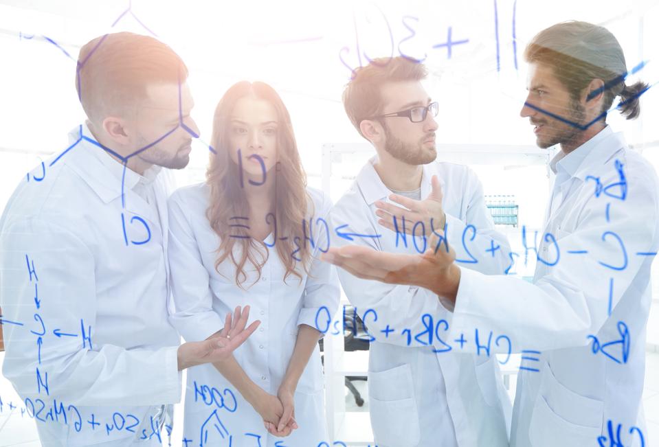 In photos that include people, though, white lab coats abound, including this group of happy lab workers who are about the be obliterated by the supernova explosion that seems to be happening somewhere behind them: