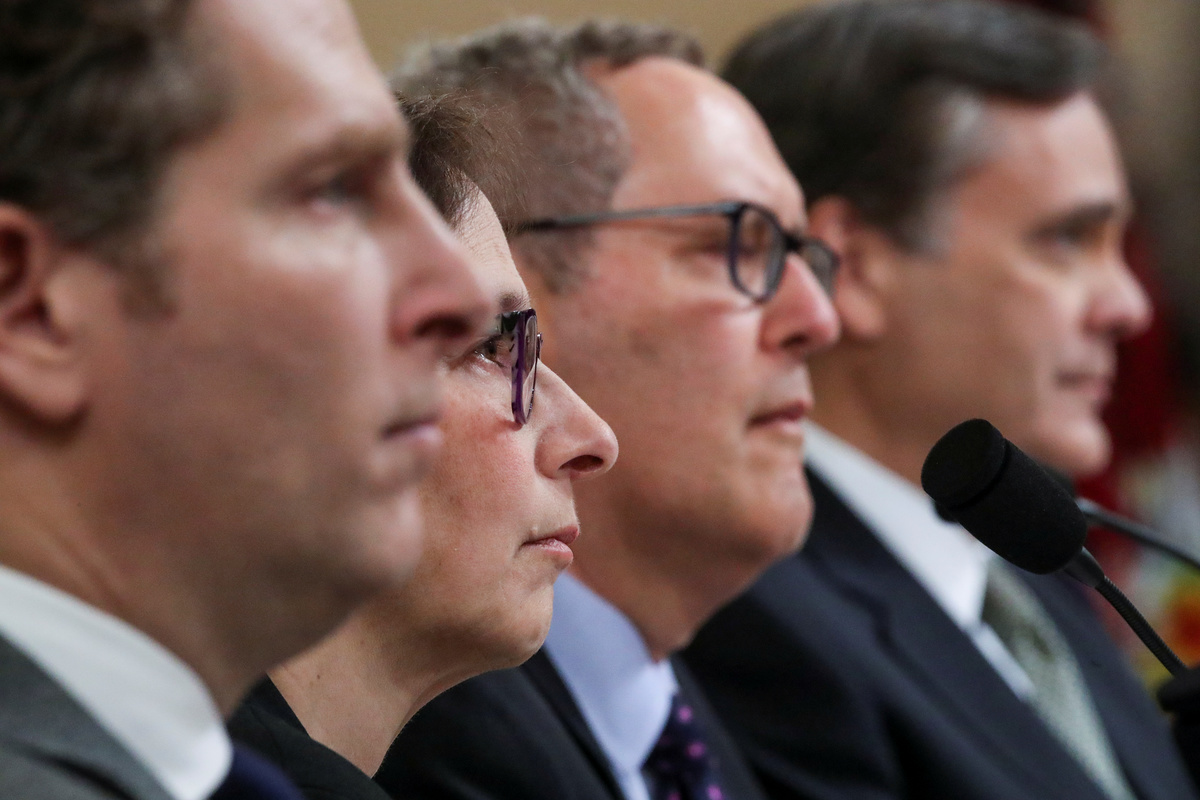 Michael Gerhardt, professor of law at University of North Carolina School of Law, testifies as he sits among fellow witnesses Noah Feldman, professor of law at Harvard University Law School, Pamela Karlan, co-director of the Supreme Court Litigation Clinic at Stanford University Law School and Jonathan Turley, professor of law at George Washington University Law School, during the first House Judiciary Committee hearing on the impeachment inquiry into U.S. President Donald Trump on Capitol Hill in Washington, U.S., December 4, 2019. REUTERS/Mike Segar