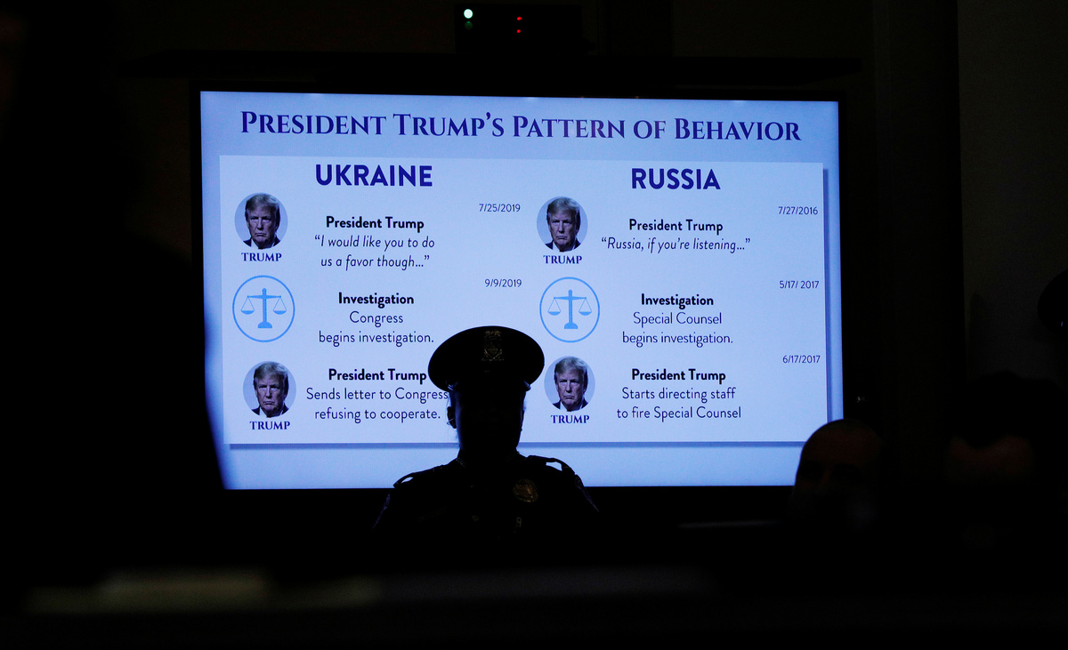 A graphic referring to "President Trump's Pattern of Behavior" is seen on a video screen behind a U.S. Capitol police officer during the House Judiciary Committee's first hearing on the impeachment inquiry into President Trump on Capitol Hill in Washington, U.S., December 4, 2019. REUTERS/Tom Brenner