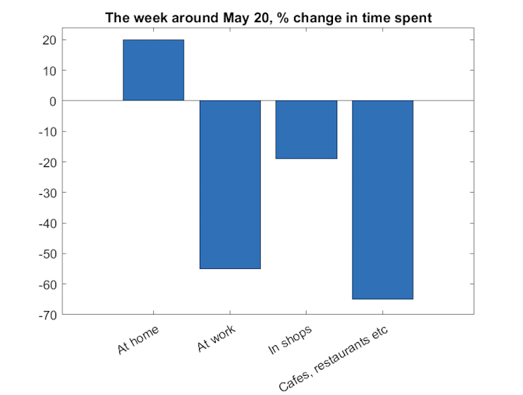 So, what was the rest of the country doing on the week of May 20 2020 when staff were gathering in the Downing Street garden? While precise data are not available, Google does release estimates of people’s movements around that time. This is based on the movement of mobile devices using Android or other Google software (Google maps etc).