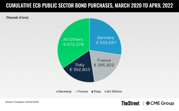 Two bond-buying programs facilitated sovereign debt purchases during this time – the Public Sector Purchase Program (PSPP) and the Pandemic Emergency Purchase Program (PEPP). These two programs bought a total of €1.95 trillion of sovereign bonds between March 2020 and April 2022. Three countries – Germany, France, and Italy – accounted for 66% of all sovereign purchases by the ECB.