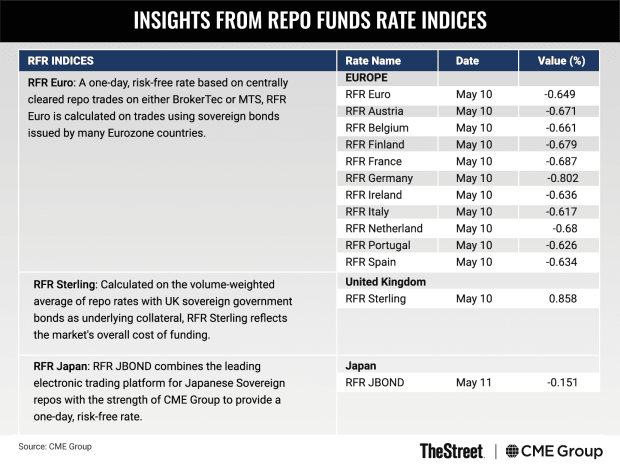 The Repo Funds Rate (RFR) Indices, compiled by CME Group, looks at daily overnight lending rates in ten sovereign bond markets across the eurozone in addition to an overarching rate for the EU. The indices provide data on two subcomponents – general collateral and specific collateral – of the repo market: