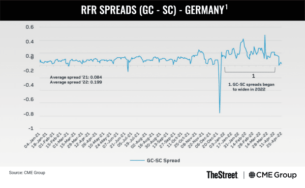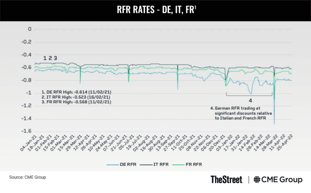 Many EU countries’ RFR rates trade more negatively now than at the beginning of 2021 despite an unchanged short-term interest rate policy. German, Italian, and French repo reached highs in the first quarter of 2021. All three countries have lower average rates in 2022 than in 2021. Lower rates are multifaceted; however, data suggests that collateral is becoming scarcer over time.
