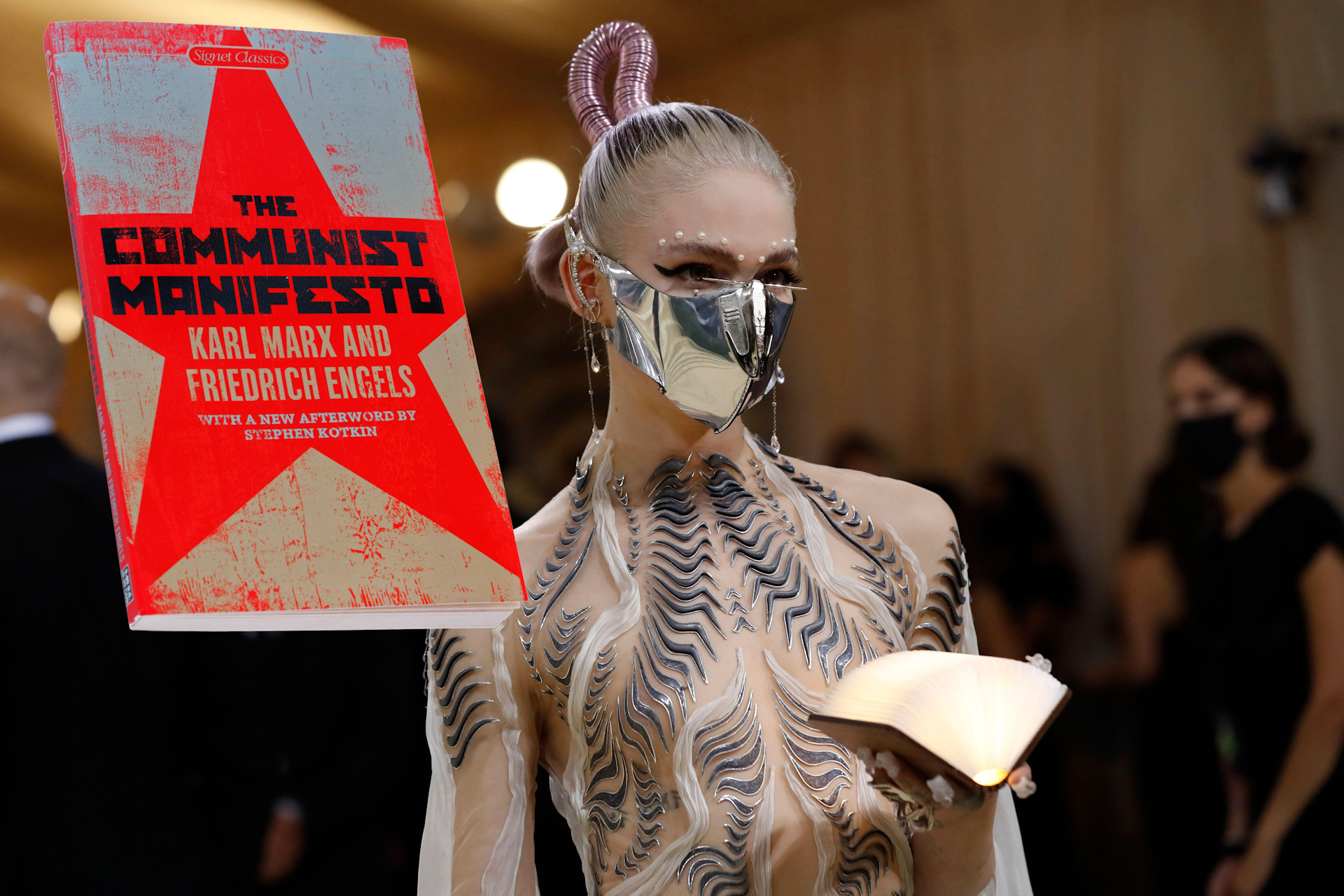 “Every country”, Marx and Engels say, now has “a cosmopolitan character”, because products from everywhere are available everywhere -– but only for those who have the money. Maybe when Grimes looked so absorbed in the short book, she was actually recalling all the places she’s been and sights she’s seen, both with Musk and their child and while on tour, in the glamorous world of high-end luxury living.