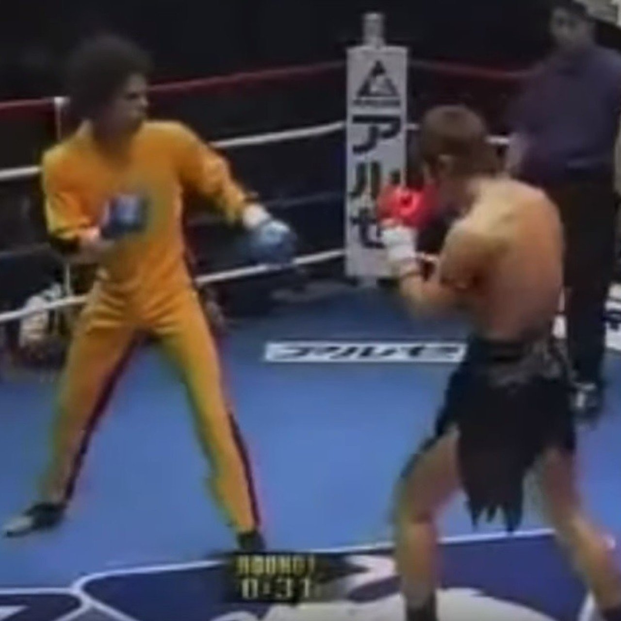 In 2003, Tony Valente – dressed in full Bruce Lee-style yellow jumpsuit – took on Takayuki “Taishin” Kohiruimaki, a skilled kyokushin karateka, for the Japanese kick-boxing promotion K-1 in 2003.