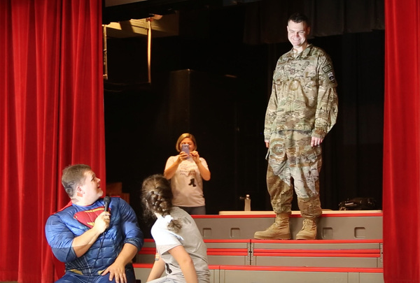 School principal Todd Boucher had called Alexia, 11, to the front of the assembly to ask her about heroes that don't wear capes. Her answer was police officers, but when the screen behind her was raised, Boucher asked, "What about this guy behind me?"
