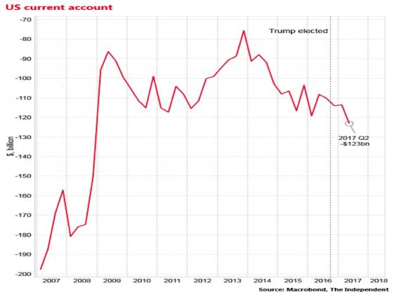 The broad US current deficit, which includes the trade deficit, in the second quarter of 2017 actually increased to $123bn (£94bn).
