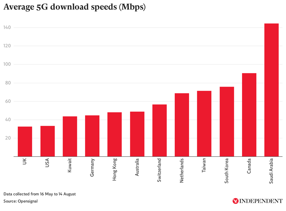 Benchmark tests carried out by mobile analytics firm Opensignal found that the UK had the slowest average 5G download speeds and worst connectivity of 12 countries tested.