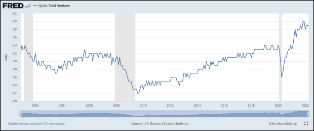 The quit rate has fallen somewhat from its November 2021 peak, but as of late June 2022, it remains relatively high at about 2.9%. Unionization efforts are still on the rise, and workers are learning about their rights and collective power.