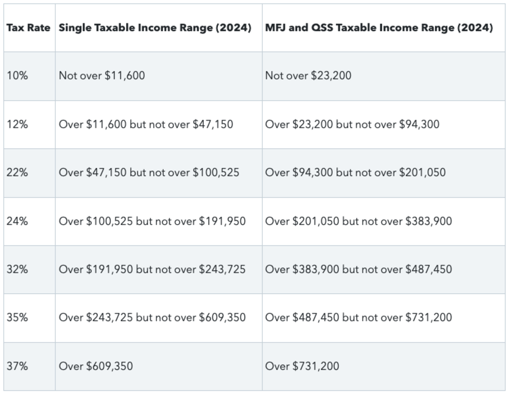 Suppose you’re single and have $50,000 in taxable income in 2024. Based on the 2024 tables above, that puts you in the 242% tax bracket.