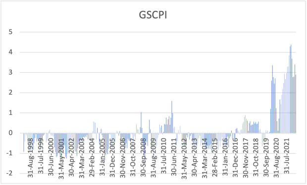 This index factors in data from a variety of sources, including backlogs, freight issues, and delivery times, and stretches back to 1997. Changes in pressures are associated with producer price inflation in the United States, making this dataset useful to watch. We look forward to seeing if a peak has occurred.