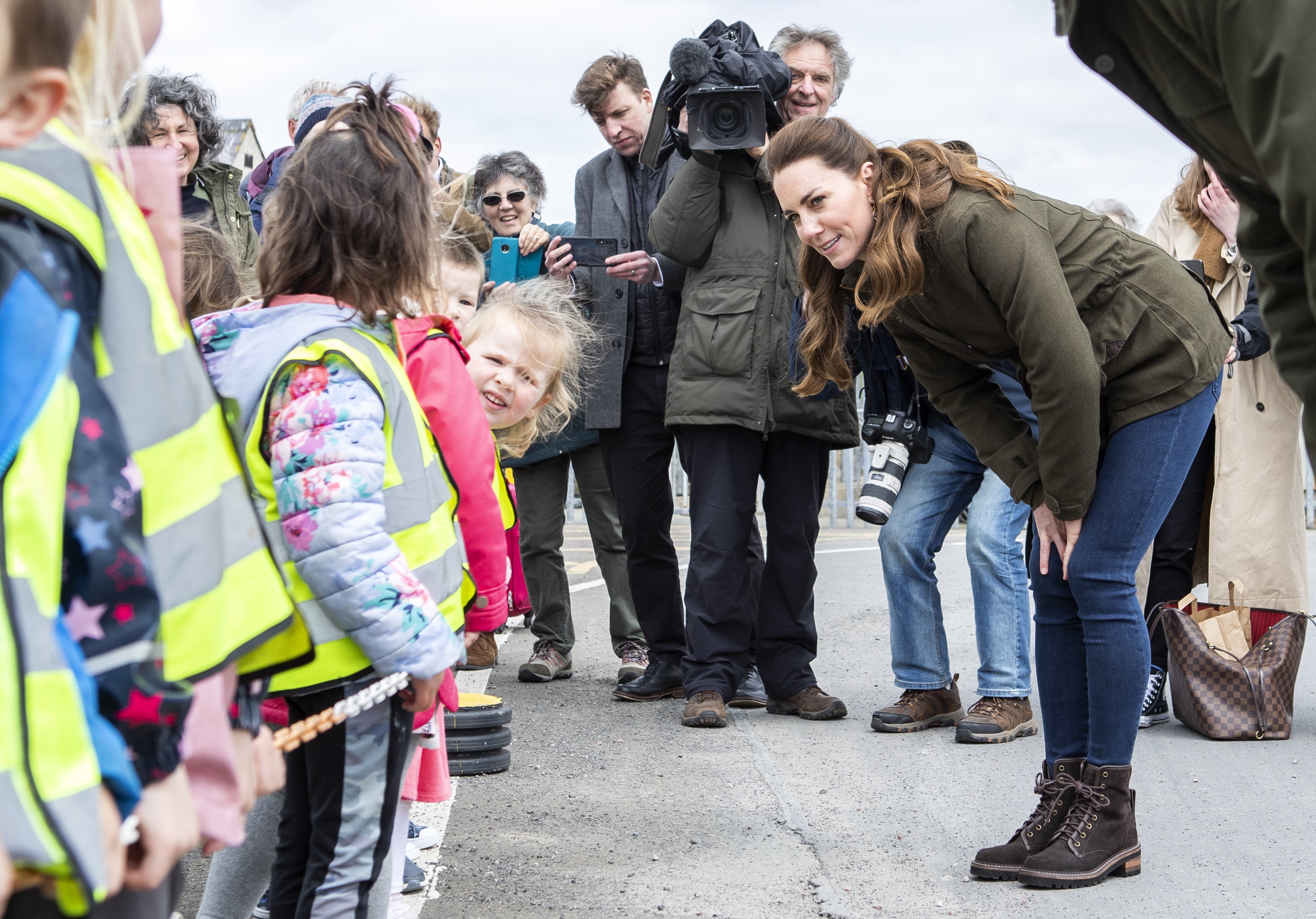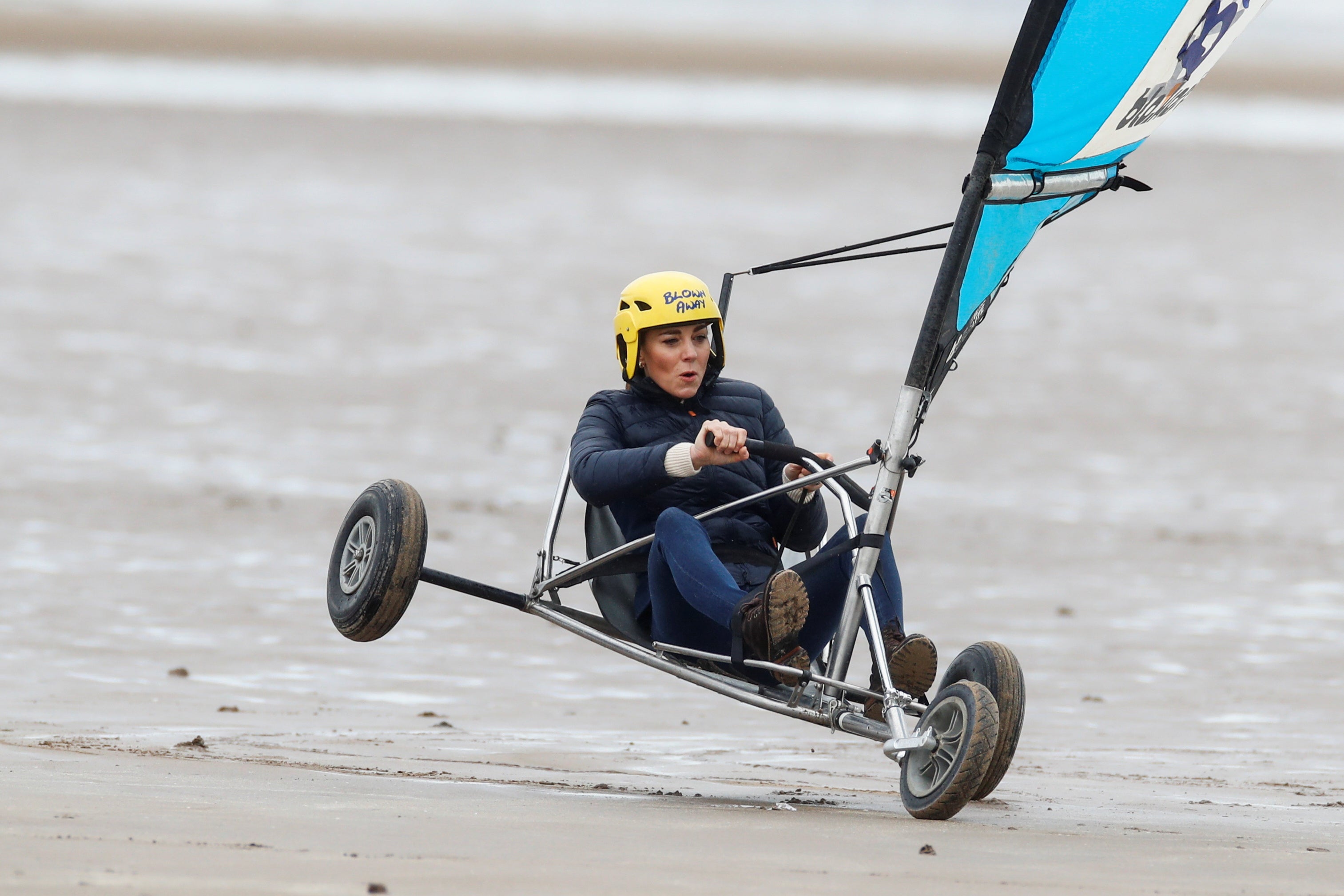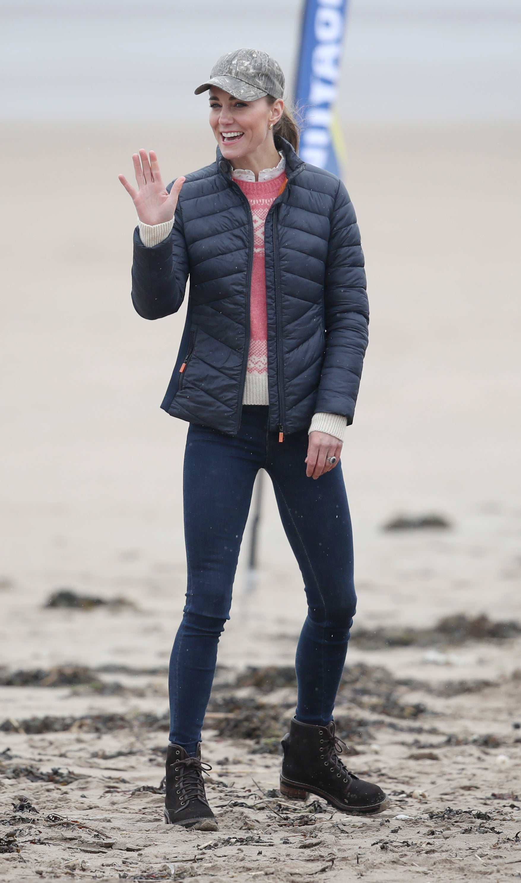 She wore a similar look to go land yachting on the beach at St Andrews – the same trusty jeans and boots, paired with a pink jumper and quilted jacket. In case you were wondering what on earth land yachting is, here’s the Duchess in action: