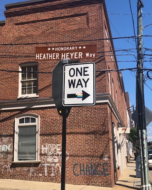 CHARLOTTESVILLE, Va.—At the intersection of Heather Heyer Way and Water Street, I enter an unofficial memorial.