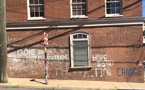 In October 2017, Charlottesville renamed a section of 4th Street in remembrance of Heyer. But the city’s memorial attempt was not what made the space. Street signs are, after all, easy to miss. What let me know I’d arrived at the crash site was less official: “GONE BUT NOT FORGOTTEN”, “CHANGE”, and other messages chalked on the side of a building; a nearby street sign wrapped in ribbons.