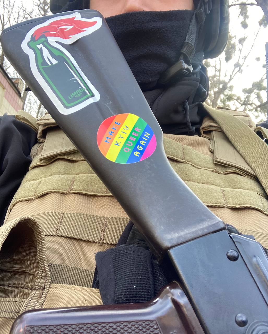 With a rainbow sticker reading "Make Kyiv Queer Again" proudly branded across his rifle, Andrii takes to the front line in the north of the capital each day.