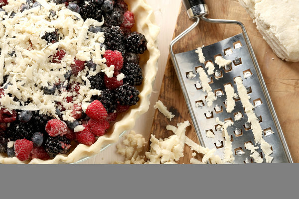 As those days wind down, we offer this pie, a take on bumbleberry from the 2004 book "Pie" by Ken Haedrich. Our version proves the adaptability point in that we've churned up Haedrich's mix to fit late summer fruit. And his method offers another easy-breezy advantage: The top crust is grated, as quick as mozzarella, over the pie. What could be simpler?