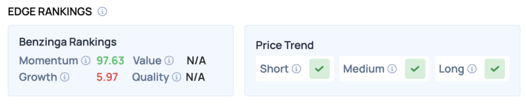 Benzinga Edge Rankings: Reflecting its recent strength, Benzinga Edge stock rankings show BBAI with an exceptionally high Momentum score of 97.63.