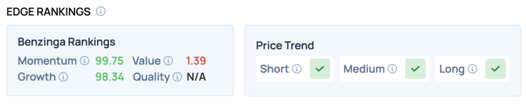 Benzinga Edge Rankings: Supporting its recent performance, Benzinga Edge stock rankings highlight the company’s exceptional strength, assigning it a Momentum score of 99.75 and a Growth score of 98.34.
