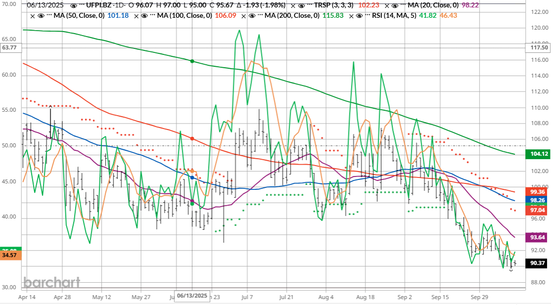 UFPI hit a two-year low of $89.76 in intraday trading on Oct. 9.