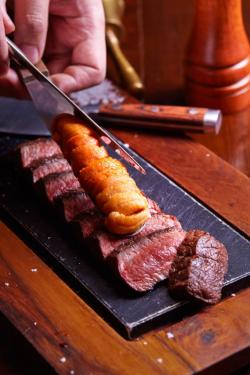 The restaurant's best-selling Flat Iron (500 baht) is a sizeable 180g flame-grilled shoulder blade steak on a stone plate. Unless diners specifically request otherwise, the steak will come medium rare.